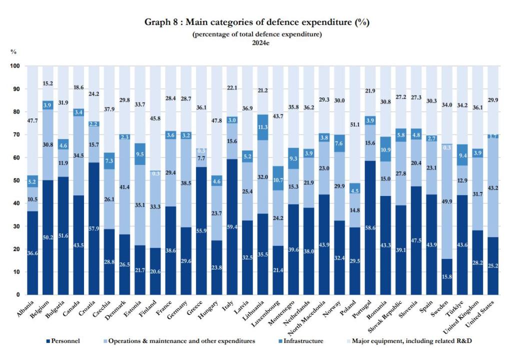 parte 4: In Italia, circa il 60% della spesa militare è destinato al personale, una percentuale che rappresenta un record in ambito NATO. Solo il 22,1% è destinato all'equipaggiamento militare, mentre il resto copre infrastrutture e manutenzione.