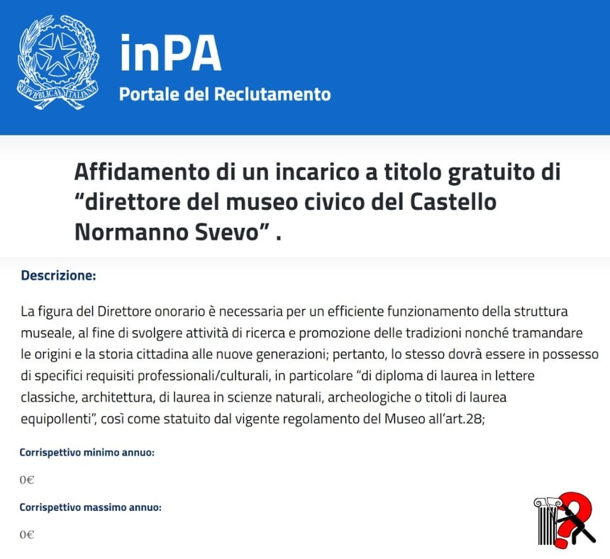 Sembra una scenetta da commedia all’italiana, quelle dove il neolaureato entusiasta scopre che la sua specializzazione in epigrafia latina vale quanto un gratta e vinci non vincente. Ma qui non si ride. Questo è un bando ufficiale, firmato e pubblicato. Siamo davanti alla realtà nuda e cruda di un Paese che da decenni si riempie la bocca di parole come “valorizzazione”, “eccellenza”, “patrimonio” – salvo poi dire a un professionista qualificato che può anche lavorare gratis, purché abbia il piacere di prestare servizio per l’onore.