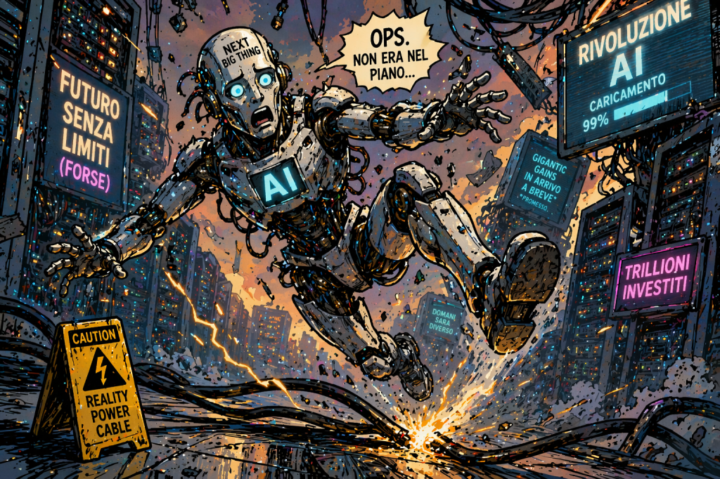 parte 2: È lo schema classico di ogni bolla: si investe per non restare esclusi, si gonfiano le aspettative e si ignora la fisica. Abbiamo preteso di elettrificare il futuro mentre le nostre reti elettriche sono ferme al secolo scorso e i trasformatori hanno tempi di consegna di cinque anni. La crisi dell'IA non è un errore del software, ma il fallimento di un modello economico che ha scambiato la velocità del marketing con la capacità di esecuzione reale.