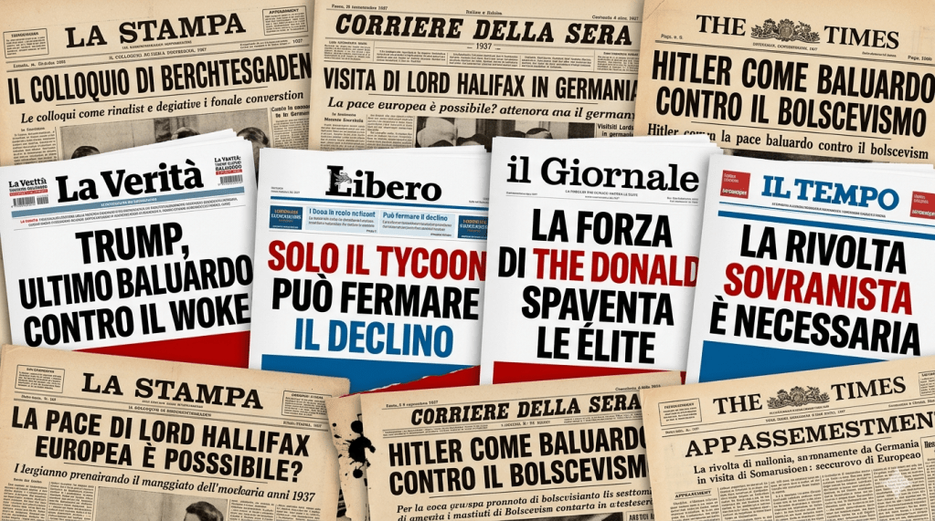 parte 1: Proprio come Halifax vedeva nei nazisti un argine ai russi, testate come "La Verità" di Belpietro o "Libero" dipingono Donald Trump come l'unico scudo contro il "wokeismo", il globalismo e la "decadenza" dei valori tradizionali. Il calcolo è lo stesso: accettare l'instabilità del leader pur di fermare il nemico ideologico.